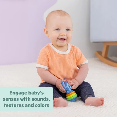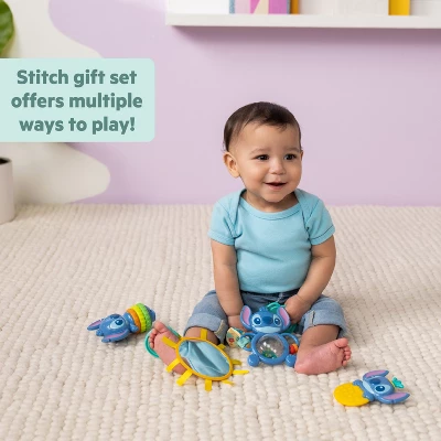 Say hello to an out-of-this-world toy set that will have baby in stitches! The Disney Baby Stitch Tropical Treasures Gift Set by Bright Starts includes three must-have baby toys for new parents, all featuring everyones favorite blue alien, plus a baby-safe mirror. The Stitch Twist-a-Stitch Fidget Toy, Stitch Tropical Teethe Rattle & Teether, Stitch Tummy Tumble Activity Toy and sunshine mirror keep baby entertained with play that nurtures their growth, from auditory and tactile stimulation to fine motor skill development and self-discovery. Plus, the pineapple-shaped teether soothes aching gums during teething time. Lightweight and easy to take on the go, you can add this set to your collection of carrier toys and stroller toys. Introduce baby to the tropical world of Stitch and add a pinch of nostalgic magic for parents at baby showers, birthdays and holidays like Christmas and Hanukkah. Newborn toys designed for 0 months and up.