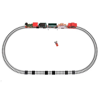 - 35 piece set includes engine, coal tender, flat bed car, caboose, box car, six figures, curved tracks, straight tracks, two signal lights, and remote-control.