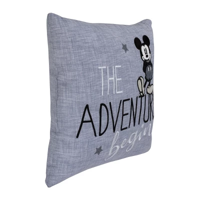 The Adventure Begins! This 15″ x 15″ blue pillow features a faux chambray look and has an embroidered script reading THE ADVENTURE BEGINS. The front also features a large Mickey Mouse applique and embroidered stars. Made from a cotton blend. A wonderful decorative accent for any nursery or toddler room! Spot clean only.