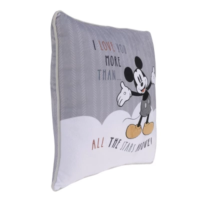 This adorable Love Mickey Decorative Pillow is the perfect finishing touch for any nursery! Designed in a plush gray chevron pattern with Mickey Mouse applique floating on white puffy clouds with the sweet saying, “I Love You More Than All The Stars Above.” Measures 15″ x 15″ x 4″. Detailed in shades of gray, white, black, and tan; reverses to a gray chevron pattern. Made from super soft fabrics. Makes a wonderful gift! Coordinates with the Disney Love Mickey Infant Bedding and Accessories!