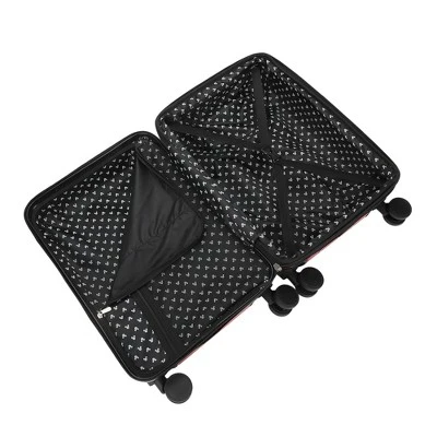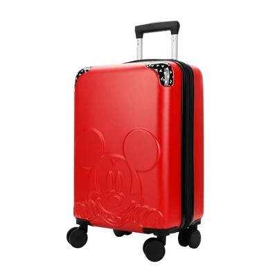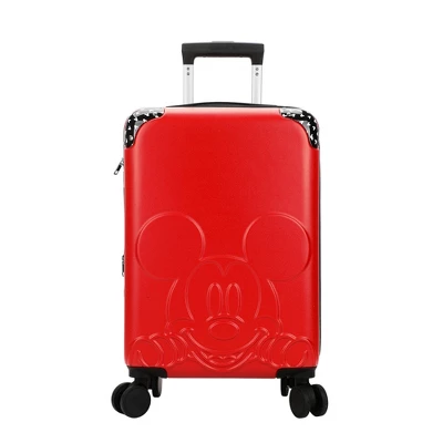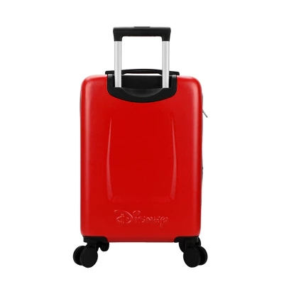 Travel in style with this red Disney 20″ hardside luggage featuring a vibrant image of Mickey Mouse on the front and a charming polka dot print on the shoulders. This durable suitcase includes a retractable trolley handle, top and side handles, and smooth-rolling wheels for effortless mobility. Inside, cross straps and a fabric-lined divider panel help keep items organized, while an expansion zipper provides extra storage. The bag can be wiped clean for easy care.