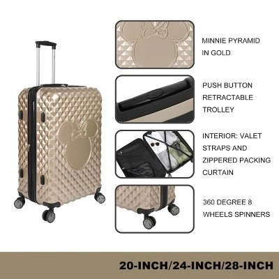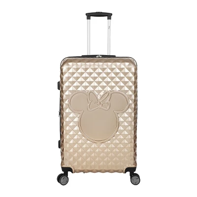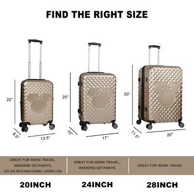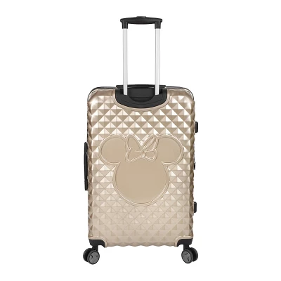 Bring signature Disney charm to your travels with this Minnie Mouse Classic rolling luggage. Featuring a molded peek-a-boo Minnie design in pink, this suitcase adds playful personality to any trip. Designed for convenience, it includes a retractable trolley handle, four smooth-rolling wheels, interior cross straps, and a zippered divider panel. Made from durable ABS, it’s easy to wipe clean and built for everyday adventures.