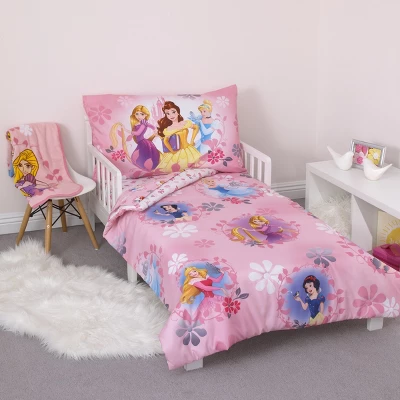 The Disney Pretty Pretty Princess 4 Piece Toddler Bed Set includes a comforter, fitted bottom sheet, flat top sheet, and reversible pillowcase. This cute comforter measures 42″ x 57″ and features the enchanting Princess Ariel, Belle, Rapunzel, Cinderella, and Snow White. Detailed with lovely florals in shades of pink, blue, yellow, lavender, and white. The fitted bottom sheet and flat top sheet are both featured in a pretty allover pattern with the princesses and pretty flowers in shades of pink, lavender and white. The top sheet measures 45″ x 60″ and fits a standard size crib/toddler mattress. The fitted sheet measures 28″ x 52″ and includes full elastic edges for a safe and snug fit. The reversible pillowcase features enchanting Ariel, Cinderella, Belle, and Rapunzel. Measures 20″ x 30″ and uses a standard size pillow. All made with snuggly soft fabrics. Perfect for your little princess room!