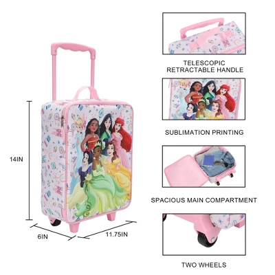 Travel in royal style with this pink Disney Princess youth pilot case. Featuring Cinderella, Moana, Mulan, Ariel, Snow White, Tiana, and Belle on a background filled with icons from their stories, this bag brings princess charm to every trip. The telescopic retractable handle and two wheels offer smooth rolling, while the interior mesh pocket keeps essentials organized. Crafted with sublimated 600D poly, it’s durable and easy to wipe clean for daily use.