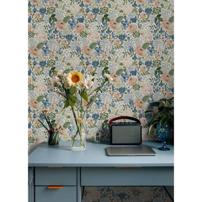 - Blue and white watercolor floral peel and stick wallpaper featuring officially-licensed imagery of the Disney Princess characters