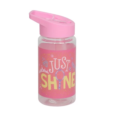 - WATER BOTTLE: Whether partying or traveling, it’s important to stay hydrated! The plastic water bottle includes a pink spill-proof lid with straw and a pastel “Just Shine” graphic.