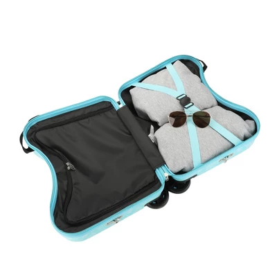 Make travel fun for your little one with this blue Disney Stitch ride-on luggage. Featuring a playful image of Stitch holding a surfboard with a bite mark and “Chill Vibes” in bright green letters, this luggage adds a touch of adventure to every trip. Equipped with wheels, a child grab handle, a push-button trolley handle, and a secure seat belt, this ride-on luggage is as practical as it is entertaining. Made with durable ABS and PC materials, it’s easy to wipe clean, ensuring it stays looking great trip after trip.
