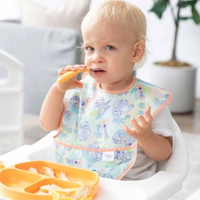 Make mealtime a walk on the beach with this set of Bumkins SuperBibs featuring Disney’s Aloha Stitch! Perfect for little eaters transitioning from purees to soft foods and solids during baby-led weaning. Bibs attach over the back of the shoulder with hook and loop for a quick, adjustable, tug-proof fit. The crumb catcher pocket helps to catch drips, drops, and spills. Made from Bumkins’ original lightweight fabric that is soft and comfortable. Constructed with single-ply fabric to prevent icky stuff from growing between layers. Fabric is waterproof and stain-resistant. Rinsing with cold water is recommended as soon as mealtime is over. To prolong the life of Bumkins SuperBibs, air drying the quick-dry fabric is recommended.
