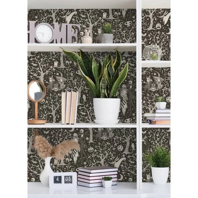 This swirling forest toile print captures the haunting beauty of Disney Tim Burton’s The Nightmare Before Christmas. Disney’s Jack Skellington and Sally, Zero the dog, the Mayor, and other beloved characters meander through a forest of dormant trees and jack-o-lanterns in this romantic peel and stick wallpaper print by RoomMates. Installation is as simple as Peel, Stick…Done!® Disney Tim Burton’s The Nightmare Before Christmas Sepia Forest Peel and Stick Wallpaper comes on one roll that measures 20.5 inches wide by 18 feet long.