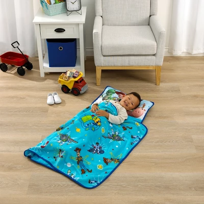 The Disney Toy Story It’s Play Time Toddler Nap Mat includes a padded nap mat with an attached pillow and cozy blanket all in one. You can simply roll up and go! Convenient carrying strap with velcro closure keeps nap mat rolled-up for storage. Travel to daycare, preschool, or a weekend at grandmas! Features a fun pattern with Woody, Buzz Lightyear, Rex, Forky and Hamm! Includes “This Belongs to” name label to write your child’s name. Designed in bright colors of shades of blue, green, red, and yellow. Measures 35.5″ x 46″ x 1″. Coordinates with Disney Toy Story It’s Play Time toddler bedding and accessories.
