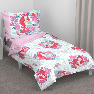 - Disney Ariel Sea Garden 4 piece Toddler Bed Set includes a 42 x 57″ comforter, 20 x 30″ pillow case, fitted and flat sheet. All fabrics are a cozy 100% polyester microfiber.