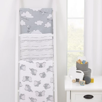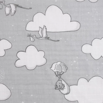 Wrap your little one in cozy softness, with the Disney Dumbo 3 Piece Muslin Swaddle Set! This adorable set of swaddle baby blankets measures 44″ x 44″ each. Features 3 prints of precious Dumbo in fun poses, an allover pattern of Dumbo flying in the clouds, another of Dumbo being delivered by storks, and the last is a matching scalloped stripe pattern! Designed in shades of gray, light gray, and white. This blanket is made of 100% cotton muslin and is the perfect size for swaddling. Makes a wonderful gift for your little bundle of joy!