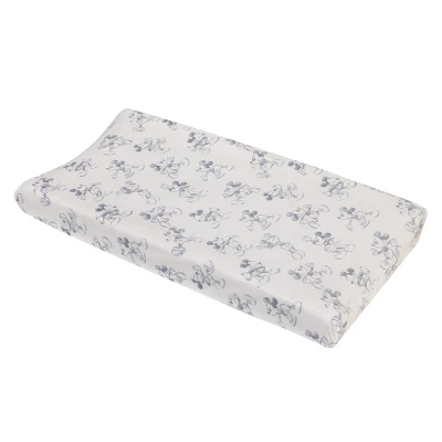 The Adventure Begins! This super soft white and gray changing pad cover is sure to keep baby cozy and dry during changing time! Features tossed gray sketch-like Mickey Mouse in different poses on a white ground. Measures 16″ x 32″ and is made from snuggly soft fabrics! This adorable pattern fits a standard size contoured changing pad. Machine washable for easy care.