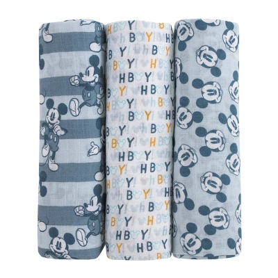 - The Mickey Mouse 3pc Swaddle Set Includes a set of 3 muslin swaddle baby blankets