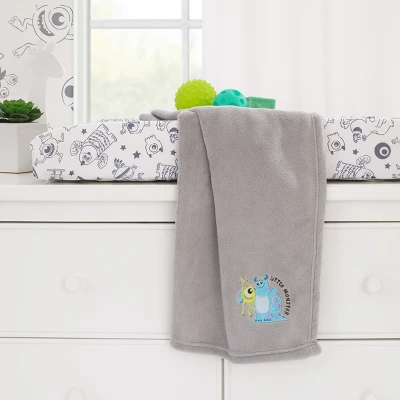 The Monsters, Inc. Cutest Little Monster Contoured Changing Pad Cover features a fun and playful allover pattern of monsters James P. Sullivan (Sully), Mike Wazowski, Randall, and friends on the sides with a light gray plush center panel. Designed in shades of charcoal gray, and white. Measures 16″ x 32″ x 6″ and fits a standard size contoured changing pad! Helps to keep baby comfortable and dry. Coordinates with Disney’s Monsters, Inc. Cutest Little Monster Crib Bedding and Accessories!