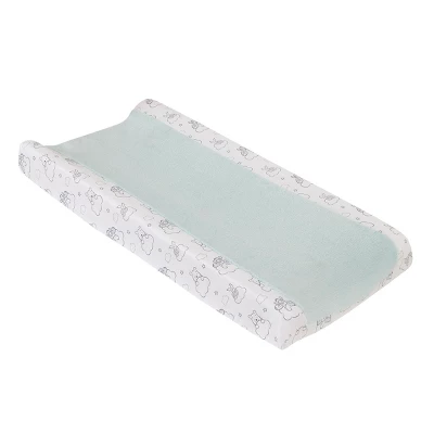 Change baby in style with the Disney Winnie the Pooh Hello Sunshine Contoured Changing Pad Cover. Features a grey and white print of Pooh, Piglet and Tigger floating on white clouds with a cozy soft aqua fleece center panel. Helps to keep your pad clean and provides a comfy surface. Measures 16″ x 32″ x 6″ and fits most contoured changing pads. Coordinates with the full line of Winnie the Pooh Hello Sunshine nursery bedding.