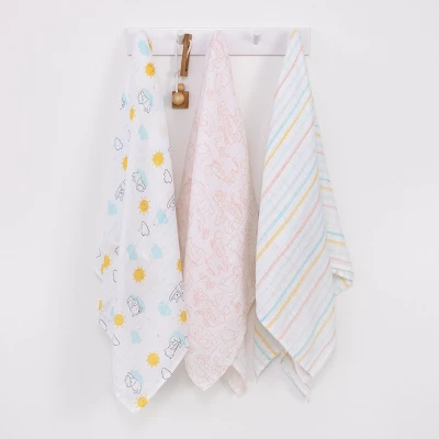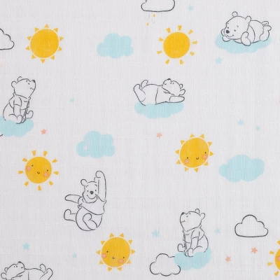 Wrap your little one in cozy softness, with the Disney Winnie the Pooh 3 Piece Muslin Swaddle Set! This adorable set of swaddle baby blankets measures 44″ x 44″ each. Features 3 prints of sweet Winnie the Pooh and friends in fun poses, an allover pattern of Pooh Bear floating on clouds, another with Winnie the Pooh, Piglet, Tigger, and Eeyore, and the last one with a colorful complimentary pinstripe pattern! Designed in shades of yellow, aqua, coral, and white. This blanket is made of 100% cotton muslin and is the perfect size for swaddling. Makes a wonderful gift for your little bundle of joy!