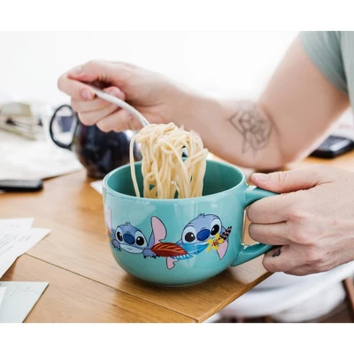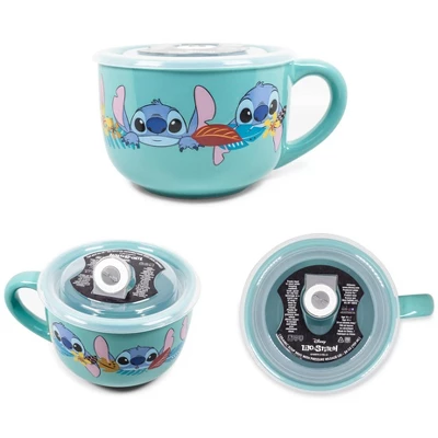 - BOTTOMS UP: This soup mug’s fun design features Stitch’s face featuring multiple expressions with a tropical “Aloha” design.