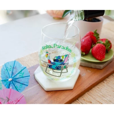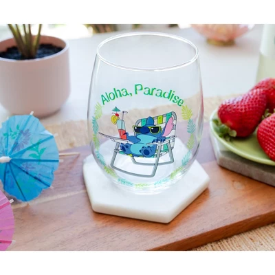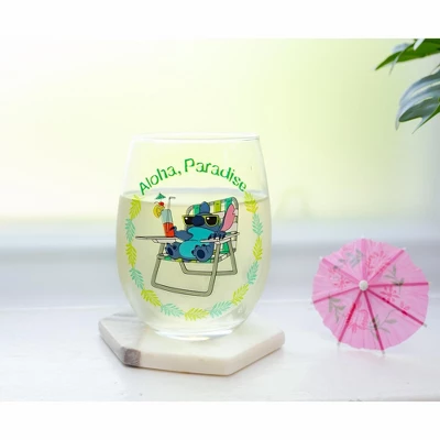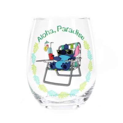 - BOTTOMS UP: Show off your love of Disney’s Lilo & Stitch with this adorable stemless glass featuring Stitch relaxing on the beach. Reads ” Aloha, Paradise”.