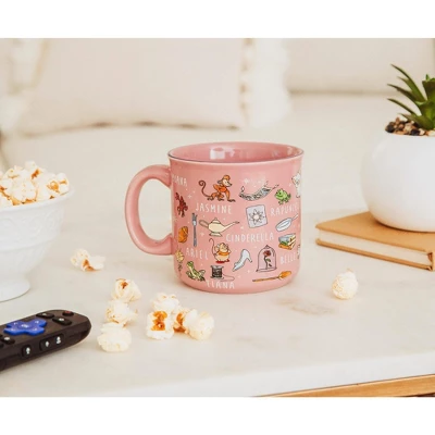 - TRENDY DRINKWARE: Mug features a pink background and features numerous Disney Princess-themed names, characters, and icons.